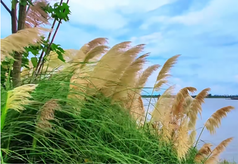 洁白的芭茅花立于河畔,与蓝天互相映衬,远远近近,层层叠叠。若是等到落日,金辉洒下,更是绝美。