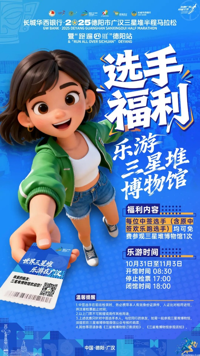 赛事福利仅限10月31日至11月3日,请各位跑友合理安排参观时间,充分感受三星堆的神秘与震撼。