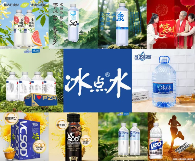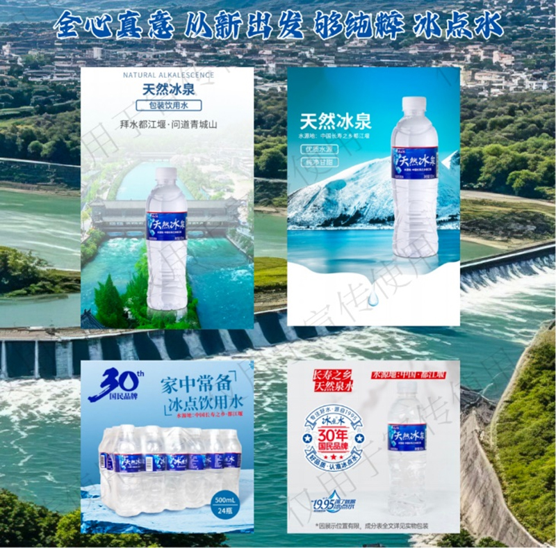 多年来,冰点水一直致力于品牌年轻化转型。近年来,冰点水将包装更换为国潮风格,广告语也从“冰点柔情,真爱滋味”变为了更加简洁有力的“用心做好水”。