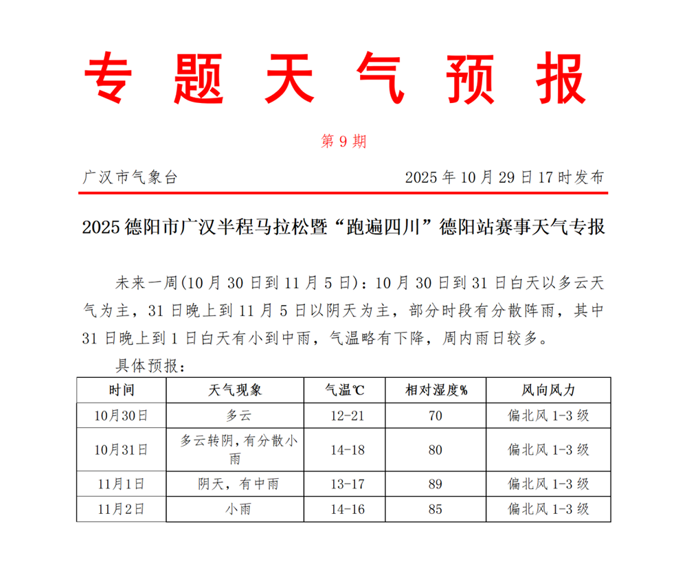 比赛日天气丨2025德阳市广汉三星堆半马天气预报
