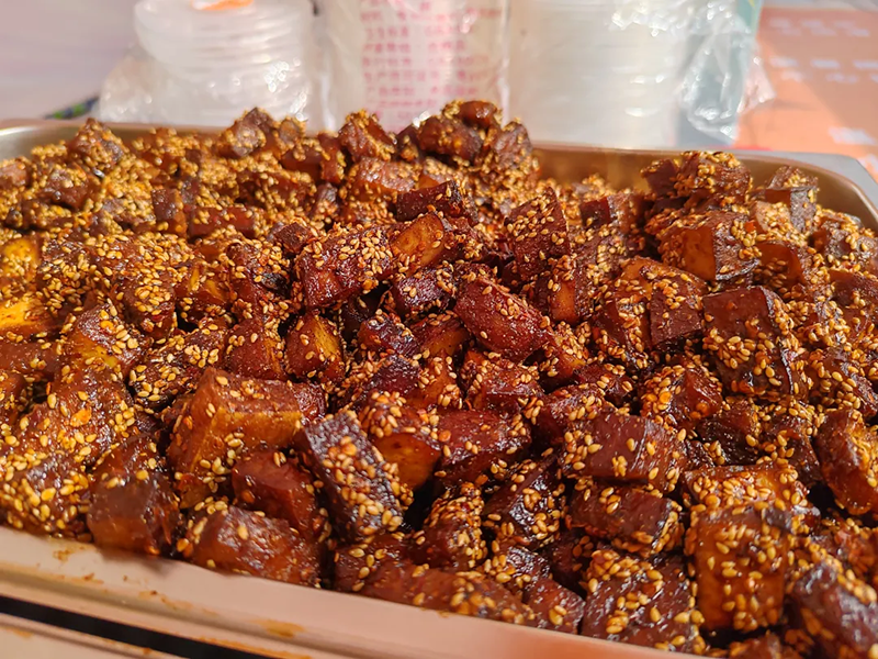 卤制豆腐干的调料配秘方独特,包含多种中草药和香料,经过长时间熬制,使豆腐干入味深、香气浓郁。口感特点皮紧实有嚼劲,内里柔软,有麻辣和五香风味,适合作为零食或佐餐小菜。